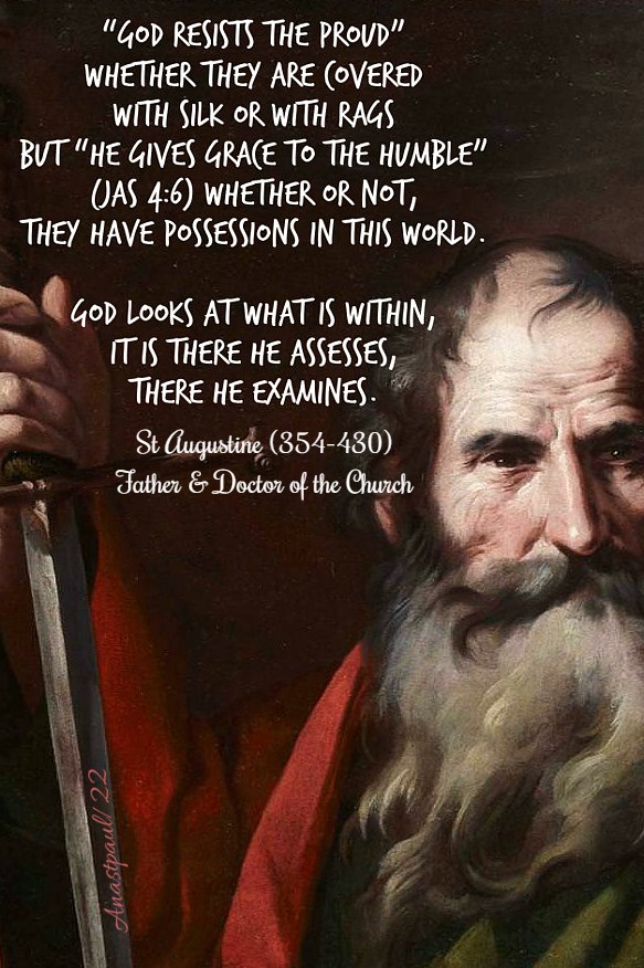 Learn to be poor and needy, then, whether you possess something in this world or whether you do not possess anything. Because we find beggars full of pride and rich people who confess their sins. “God resists the proud” whether they are covered with silk or with rags but “he gives grace to the humble” (Jas 4:6) whether or not, they have possessions in this world. God looks at what is within, it is there He assesses, there He examines.” … Saint Augustine (354-430) Father & Doctor of the Church (Discourses on the psalms, Ps 85 [86]; CCL 39, 1178)