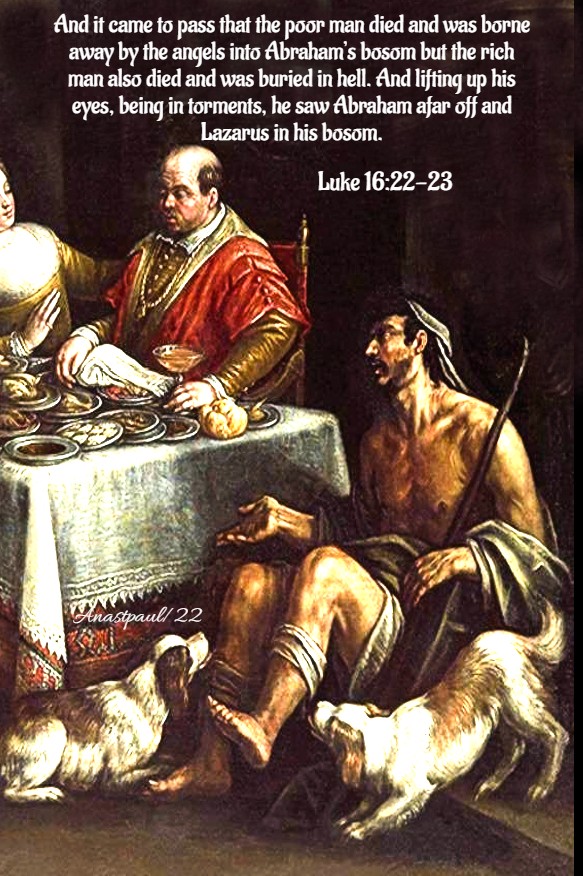 “And it came to pass that the poor man died and was borne away by the angels into Abraham’s bosom but the rich man also died and was buried in hell. And lifting up his eyes, being in torments, he saw Abraham afar off and Lazarus in his bosom.” – Luke 16:22-23