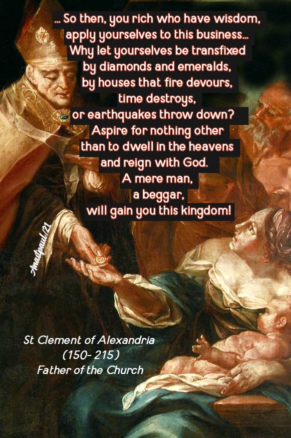 “… So then, you rich who have wisdom, apply yourselves to this business… Why let yourselves be transfixed by diamonds and emeralds, by houses that fire devours, time destroys, or earthquakes throw down? Aspire for nothing other than to dwell in the heavens and reign with God. A mere man, a beggar will gain you this kingdom!”