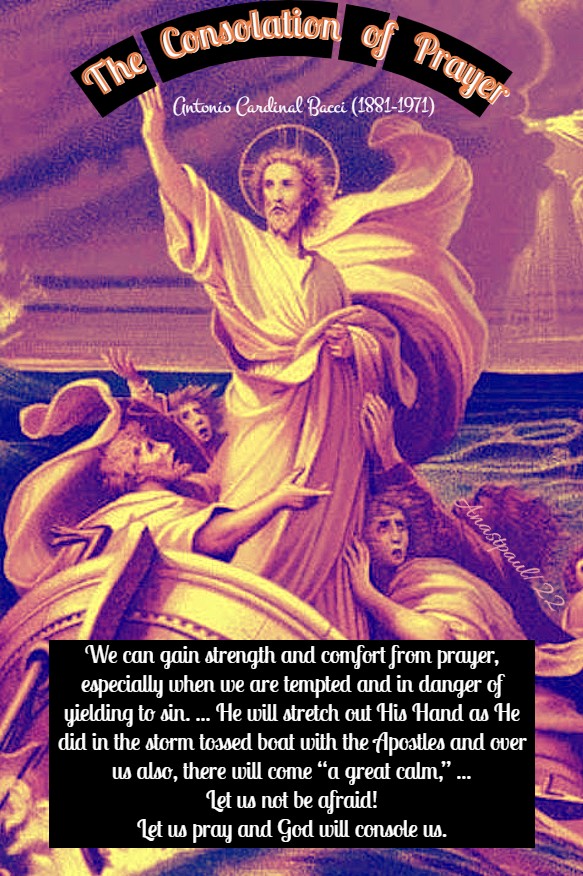“We can gain strength and comfort from prayer, especially when we are tempted and in danger of yielding to sin. God may not answer us immediately because He may wish to try our faith and love. But, if we persist and tell Jesus that we would die rather than offend Him, He will take pity on us. He will stretch out His Hand as He did in the storm tossed boat with the Apostles and over us also, there will come “a great calm” (Mt 8:26, Mk 4:39, Lk 8:24). Any sacrifice on our part is amply repaid by the peace which follows victory over temptation.