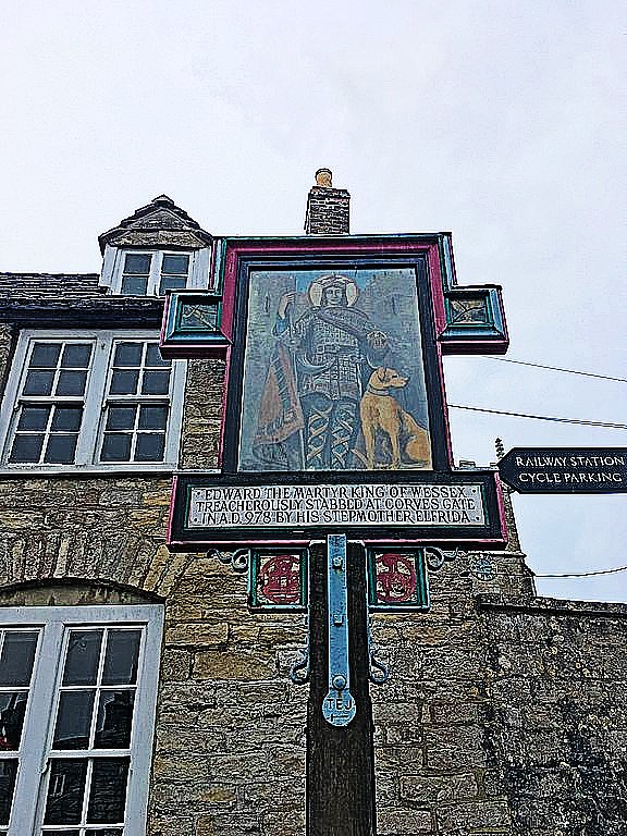 Commemorative sign for Saint Edward the Martyr at Corfe Castle, Dorset. Uunder the Painting of St Edward is written “Edward the Martyr King of Wessex treacherously stabbed at Corves gate in 978 by his stepmother Elfrida.