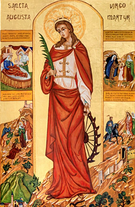 St. Augusta is depicted with the symbols of her Martyrdom, a toothed wheel for torture, her teeth that were torn from her, mouth and her palm. On the hill of St Augusta, there are still the remains of the castle of the grim father Matruco and the large Church dedicated to her.