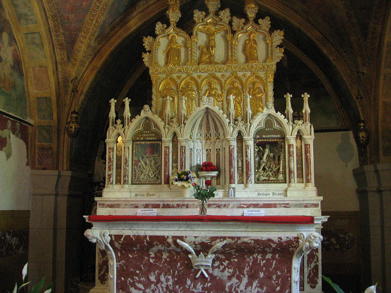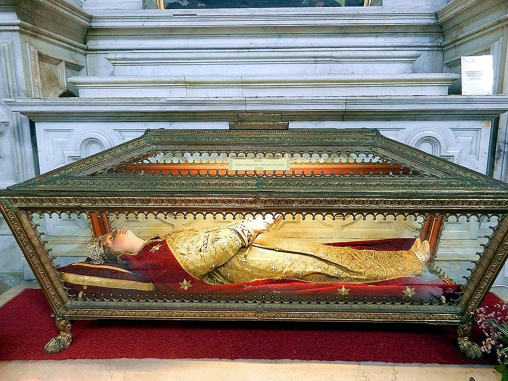 Augusta secretly embraced the Christian Faith but her father learned of it anyway and had her arrested. Since she refused to apostatise, she was thrown into a prison and after various tortures, she was beheaded by her own father. Her body was found a few years later buried on a hill overlooking Serravalle, which took her name. A Church was built and was dedicated to her – a Church and Shrine, which became very popular with the inhabitants.
