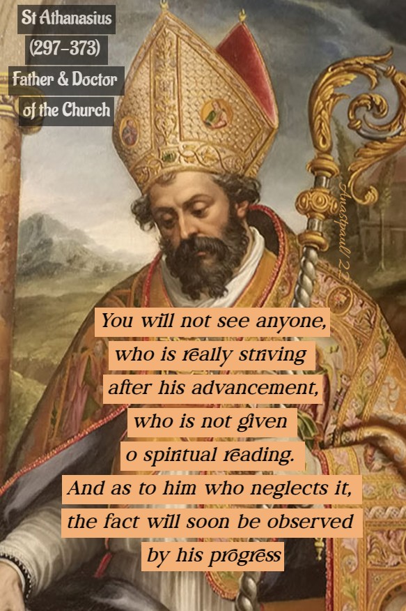 PRAYER – Hear, we beseech You, O Lord, our prayers which we offer You on the feast of blessed Athanasius, Your Bishop and Confessor and absolve us from all our sins by the merits and prayers of him, who had the grace to serve You worthily. Through Jesus Christ, Thy Son our Lord, Who lives and reigns with Thee, in the unity of the Holy Ghost, God, world without end. Amen (Collect).