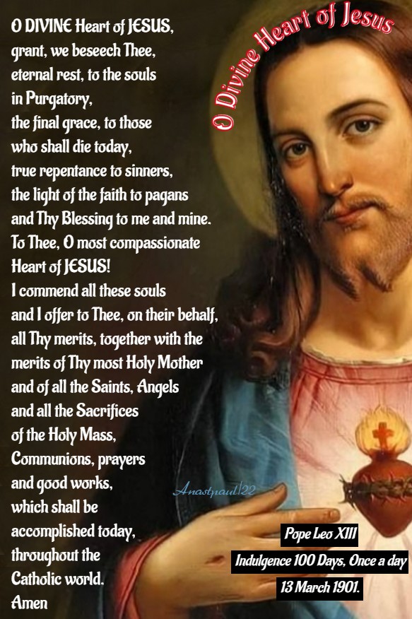 O DIVINE Heart of JESUS, grant, we beseech Thee, eternal rest, to the souls in Purgatory, the final grace, to those who shall die today, true repentance to sinners, the light of the faith to pagans and Thy Blessing to me and mine. To Thee, O most compassionate Heart of JESUS! I commend all these souls and I offer to Thee, on their behalf, all Thy merits, together with the merits of Thy most Holy Mother and of all the Saints, Angels and all the Sacrifices of the Holy Mass, Communions, prayers and good works, which shall be accomplished today, throughout the Catholic world. Amen