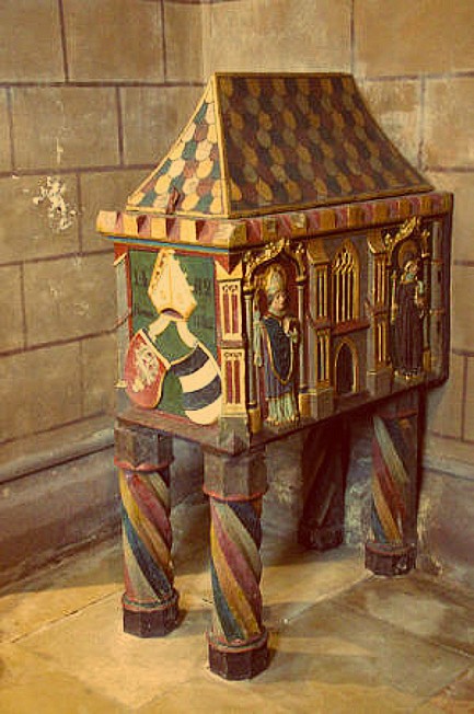 He died at an advanced age and received his final resting place in a Shrine in the Collegiate Church of St Vitus and St Deochar in Hasareoda / Herrieden. In 1316. a part of his Relics was transferred by King Ludwig as the spoils of victory, to the Chapel in the Church of St Lorenz in Nuremberg, now named after Deochar. In 1845 they came to Eichstätt . The part of the Relics brought by King Ludwig to his residence, the Alter Hof in Munich, was destroyed in World War II.