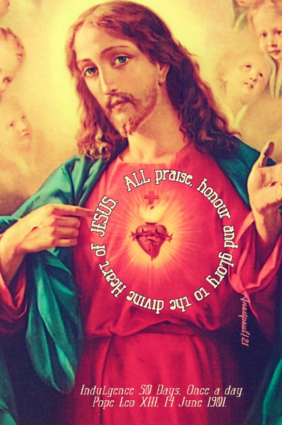 All praise, honour and glory to the divine HEART of JESUS. – Indulgence 50 Days, Once a day. Raccolta 168 Pope Leo XIII, 14 June 1901.