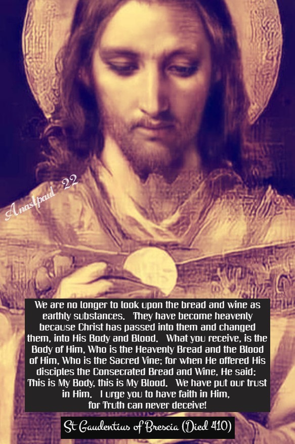 When Christ told the crowds that they must eat His Flesh and Drink His Blood, they were horrified and began to murmur among themselves: This teaching is too hard; who can be expected to listen to it? As I have already told you, thoughts such as these must be banished. The Lord Himself used heavenly fire to drive them away by going onto declare – It is the Spirit that gives life; the flesh is of no avail. The words that I have spoken to you, are Spirit and Life!” – St Gaudentius of Brescia (Died 410) Bishop , renowned Preacher, Theologian, Diplomatic Mediator (An Excerpt from Tractate 2).