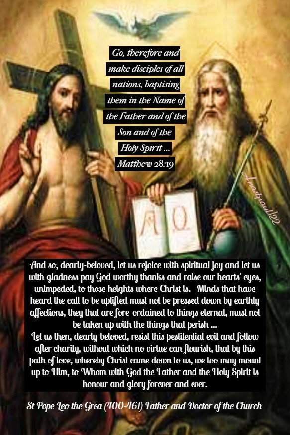 Let us then, dearly-beloved, resist this pestilential evil and follow after charity, without which no virtue can flourish, that by this path of love, whereby Christ came down to us, we too may mount up to Him, to Whom with God the Father and the Holy Spirit is honour and glory forever and ever.” – St Leo the Great, Pope (400-461) Father and Doctor of the Church (Sermon 74).