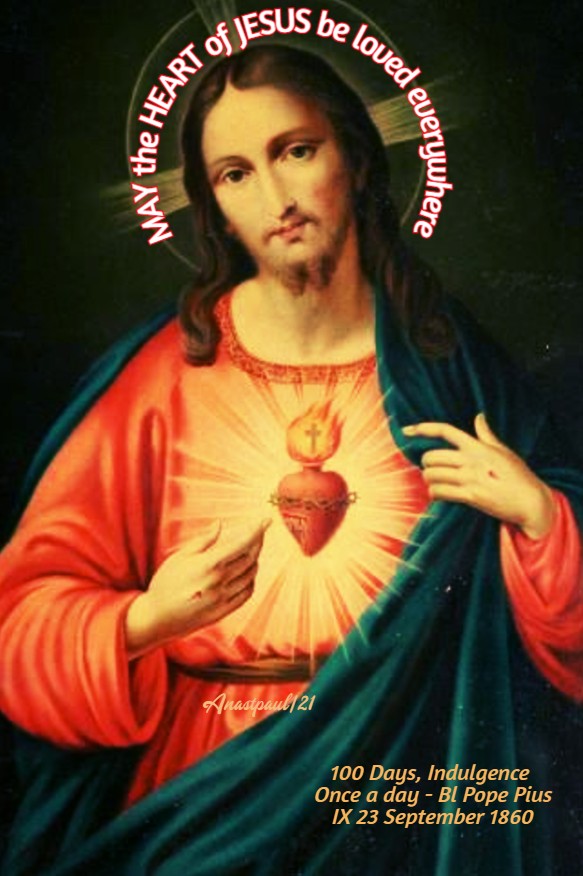 PRAYER – Almighty, eternal God, Thou Who have given Thy servants, in the confession of the true faith, to acknowledge the glory of the eternal Trinity and in the power of that Majesty, to adore its unity, grant, we beseech Thee, that in the firmness of this faith, we may ever be protected from all harm. Through Jesus Christ, Thy Son our Lord, Who lives and reigns with Thee, in the unity of the Holy Ghost, God, world without end. Amen (Collect). MAY the HEART of JESUS be loved everywhere. 100 Days, Indulgence Once a day – Bl Pope Pius IX 23 September 1860