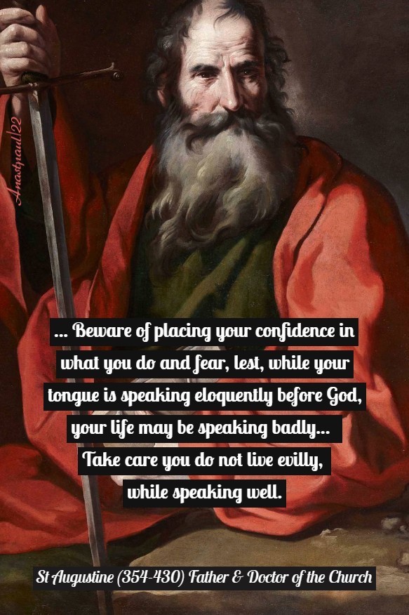 REFLECTION – “Someone, having listened to the verse: “Offer to God a sacrifice of praise” (Ps 50[49].14), said to himself: “I will go to Church every day when I get up and sing a morning hymn; then an evening hymn at the end of the day and then, in my own home, a third and fourth hymn. This is how I will make a sacrifice of praise everyday and offer it to my God.” It is good to do this if you do it in truth but beware of placing your confidence in what you do and fear lest, while your tongue is speaking eloquently before God, your life may be speaking badly… Take care you do not live evilly, while speaking well.”…St Augustine (354-430) Father & Doctor of the Church
