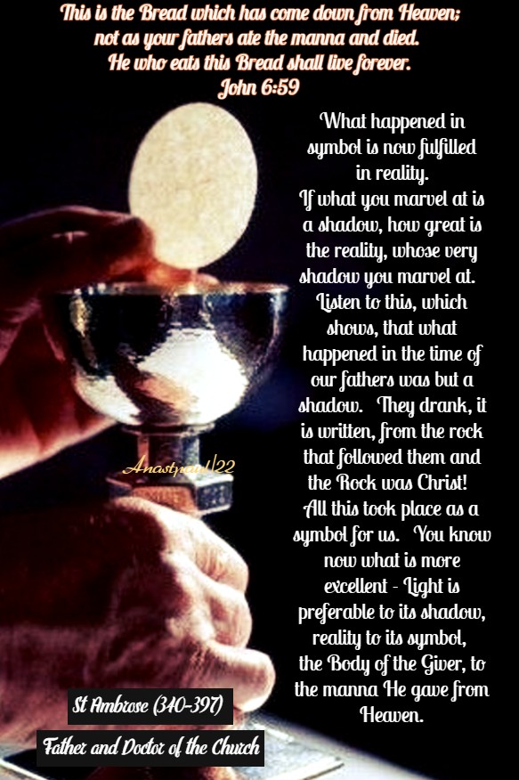 If what you marvel at is a shadow, how great is the reality, whose very shadow you marvel at. Listen to this, which shows, that what happened in the time of our fathers was but a shadow. They drank, it is written, from the rock that followed them and the Rock was Christ! All this took place as a symbol for us. You know now what is more excellent – Light is preferable to its shadow, reality to its symbol, the Body of the Giver, to the manna He gave from Heaven.” – St Ambrose (340-397) Great Western Father and Doctor of the Church (An excerpt from On the Mysteries).
