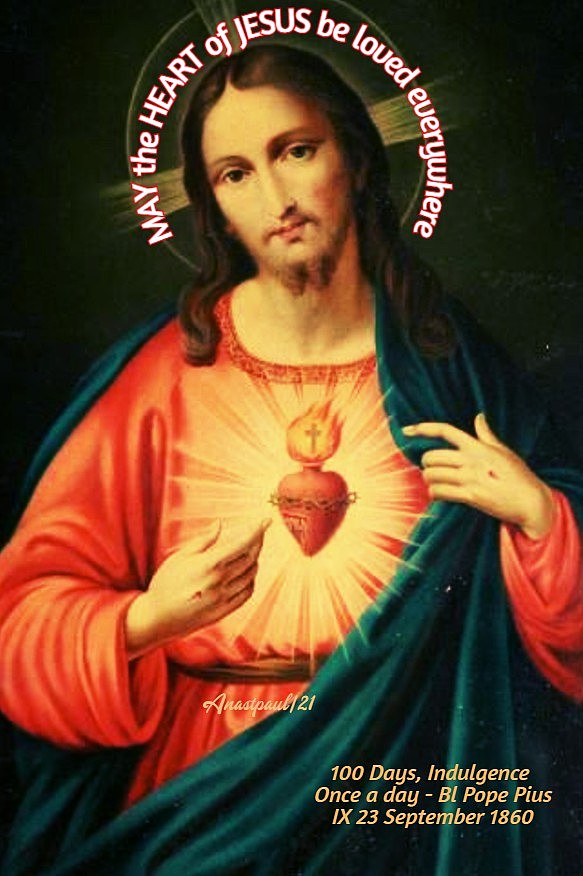 PRAYER – O God, Thou Who in this wondrous Sacrament have left us a memorial of Thy Passion, grant us, we beseech Thee, so to venerate the Sacred Mysteries of Thy Body and Blood, that we may ever experience, within us, the effect of Thy Redemption. Through Jesus Christ, Thy Son our Lord, Who lives and reigns with God the Father, in the unity of the Holy Ghost, God, world without end. Amen (Collect). MAY the HEART of JESUS be loved everywhere.100 Days, Indulgence Once a day – Pope Pius IX 23 September 1860.