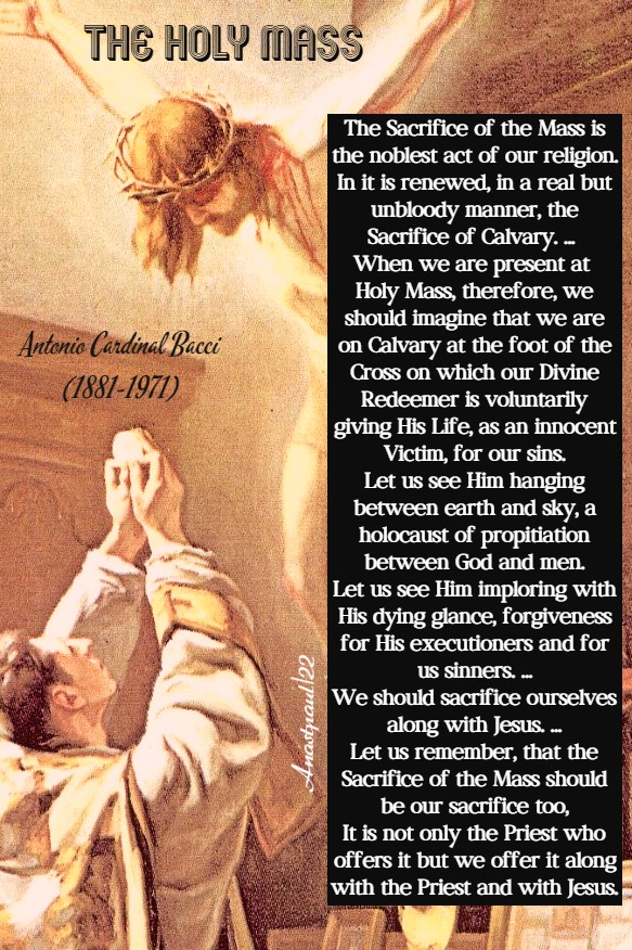 “The Sacrifice of the Mass is the noblest act of our religion. In it is renewed, in a real but unbloody manner, the Sacrifice of Calvary.