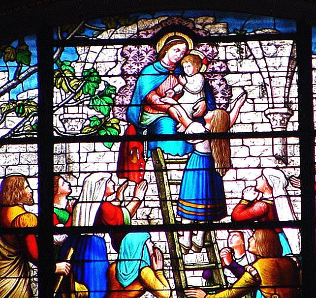 Stained glass representations of Saint Godelieve and saint Idesbald.