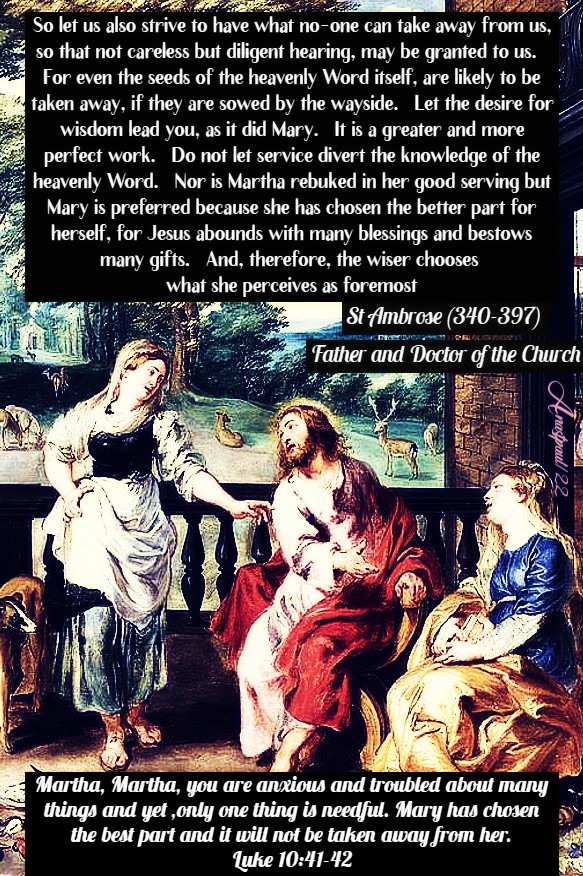 So let us also strive to have what no-one can take away from us, so that not careless but diligent hearing, may be granted to us. For even the seeds of the heavenly Word itself, are likely to be taken away, if they are sowed by the wayside. Let the desire for wisdom lead you, as it did Mary . It is a greater and more perfect work. Do not let service divert the knowledge of the heavenly Word. Nor is Martha rebuked in her good serving but Mary is preferred because she has chosen the better part for herself, for Jesus abounds with many blessings and bestows many gifts. And, therefore, the wiser chooses what she perceives as foremost.” – St Ambrose (340-397) Archbishop of Milan, Father and Doctor of the Church (Exposition of the Gospel of Luke, 7).