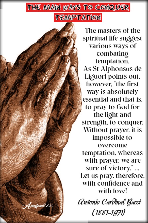 “The masters of the spiritual life suggest various ways of combating temptation. As St Alphonsus de Liguori points out, however, “the first way is absolutely essential and that is, to pray to God for the light and strength, to conquer. Without prayer, it is impossible to overcome temptation, whereas with prayer, we are sure of victory” (Al Servizio Divino p 22, c 6).