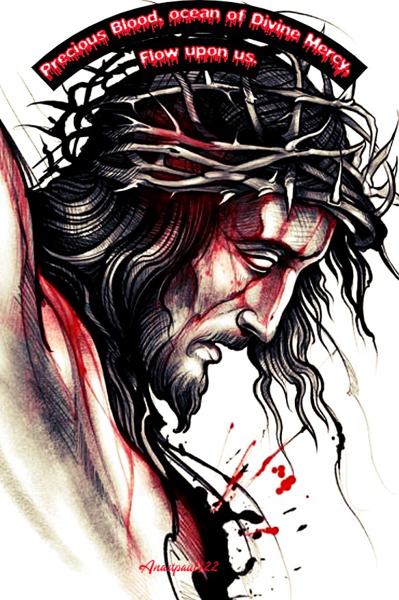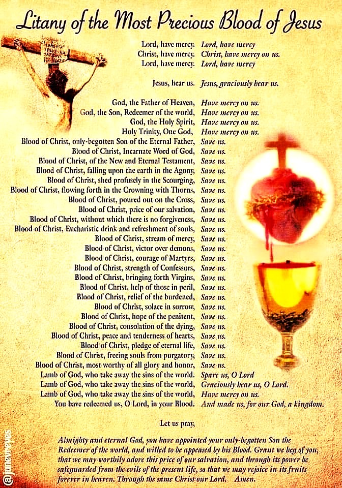 PRAYER – Almighty, eternal God, Who made Thy Only Begotten Son the Redeemer of the world and willed to be reconciled by His Blood, grant us, we beseech Thee, so to worship in this Sacred rite the price of our salvation and to be so protected by its power against the evils of the present life on earth, that we may enjoy its everlasting fruit in Heaven. Through the same Jesus Christ, Thy Son our Lord, Who lives and reigns with Thee, in the unity of the Holy Ghost, God, world without end. Amen (Collect). Aspiration:Precious Blood, ocean of Divine Mercy, Flow upon us.