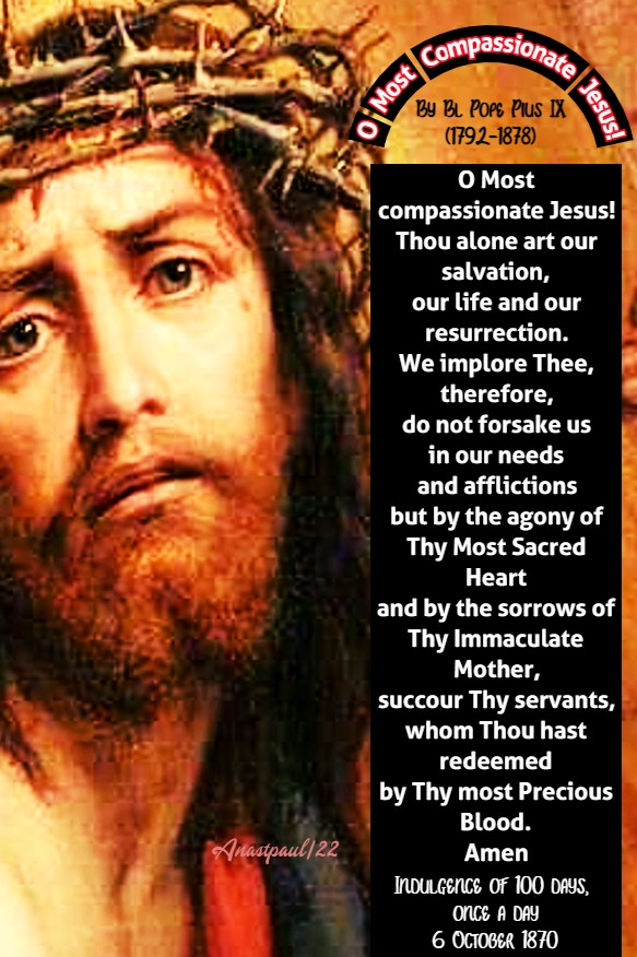 O Most Compassionate Jesus! By Blessed Pope Pius IX (1792-1878) Indulgence of 100 days, once a day 6 October 1870