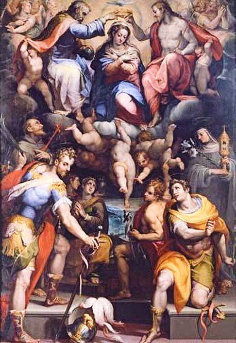 The Virgin Mary Crowned by the Holy Trinity, with Saints Francis, Claire, John the Baptist, Saint Mary Magdalene, Catherine of Alexandria and (in the foreground) Nabor and Felix; painted by Orazio Samacchini ca. 1575 for the Church of San Francesco Grande in Milan, now in the National Painting Gallery in Bologna.