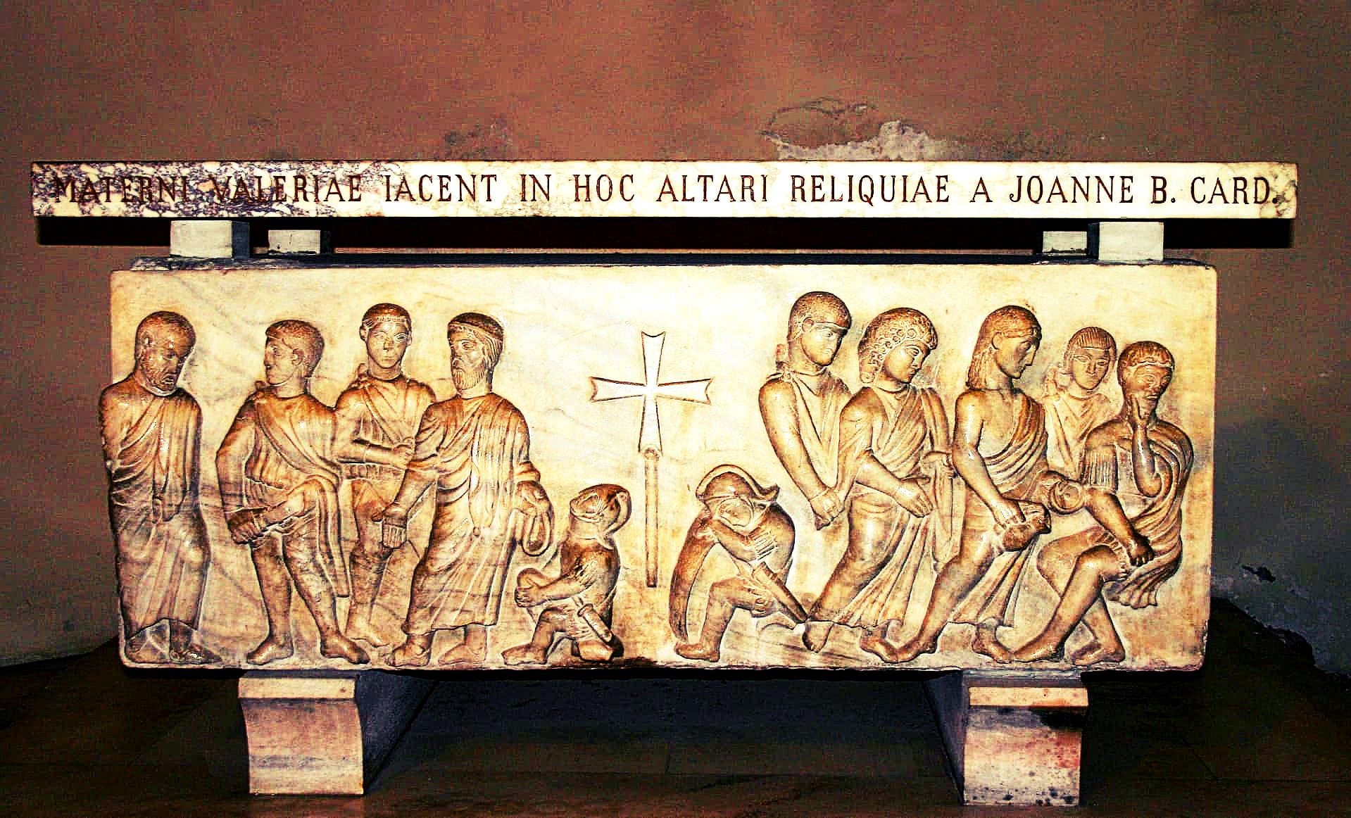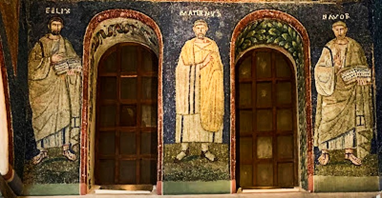 Within the Basilica of St Ambrose in Milan, the Chapel known as “San Vittore in Ciel d’Oro – St Victor in the Heaven of Gold” contains a mosaic portrait of the Bishop of Milan at the time of this translation, St Maternus, with the Mart,yrs to either side of him. On the opposite wall are St Ambrose with Ss Gervasius and Protasius, underlining the parallels between the two Bishops in their devotion to the Martyrs. And in point of fact, the place where St Ambrose discovered the relics of Gervasius and Protasius, was very close to the Basilica Naboriana.