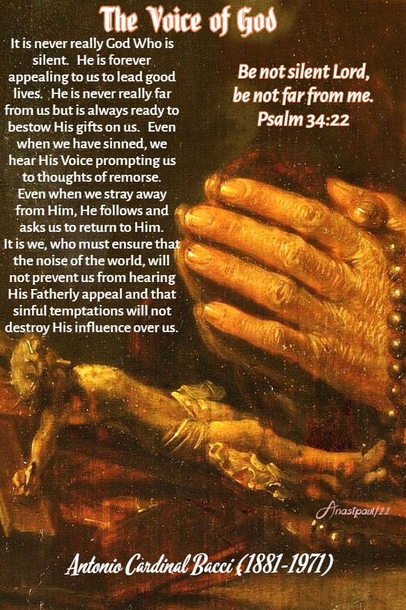 It is never really God Who is silent. He is forever appealing to us to lead good lives. He is never really far from us but is always ready to bestow His gifts on us. Even when we have sinned, we hear His Voice prompting us to thoughts of remorse. Even when we stray away from Him, He follows and asks us to return to Him. It is we, who must ensure that the noise of the world, will not prevent us from hearing His Fatherly appeal and that sinful temptations will not destroy His influence over us.