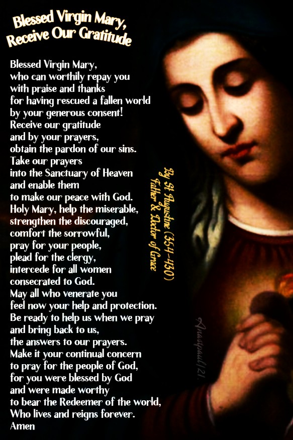 PRAYER – Grant us, Thy servants, O Lord God, we beseech Thee, to enjoy lasting health of mind and body and by the intercession of glorious and Blessed Mary, ever Virgin, may be delivered from present sorrow and partake of the fullness of eternal happiness. Through Jesus Christ, Thy Son our Lord, Who lives and reigns with Thee, in the unity of the Holy Ghost, God, world without end. Amen (Collect).