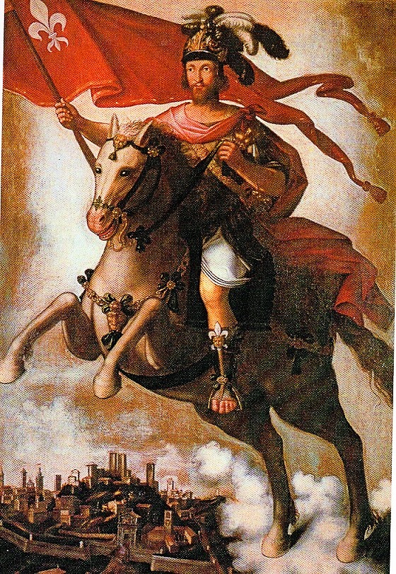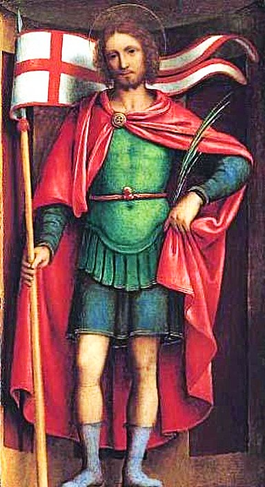 Alexander, Patron Saint of the City and Diocese of Bergamo, is traditionally portrayed dressed as a Roman soldier with a banner bearing a white fleur-de-lis. The banner was that of the Theban Legion of St Maurice (a Roman legion consisting, according to legend, of only Egyptian soldiers of the Thebaide region) in which Alexander was, according to the Acts of Martyrdom, a Centurion Commander.