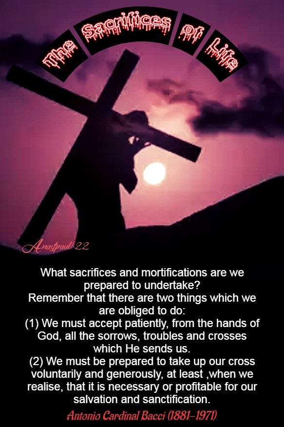 What sacrifices and mortifications are we prepared to undertake? Remember that there are two things which we are obliged to do: (1) We must accept patiently, from the hands of God, all the sorrows, troubles and crosses which He sends us. (2) We must be prepared to take up our cross voluntarily and generously, at least ,when we realise, that it is necessary or profitable for our salvation and sanctification.”