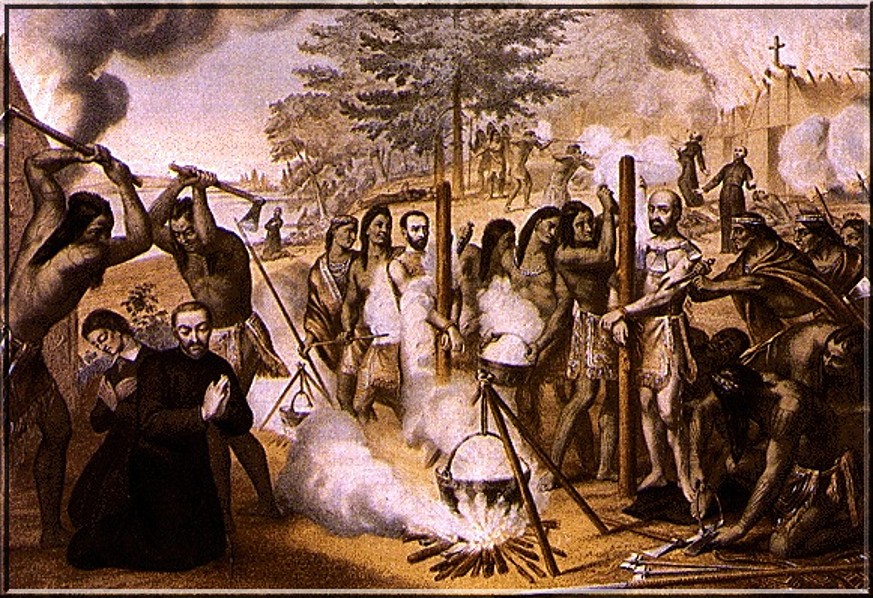 On 4 July 1648, in an attack upon the village of St Joseph by the Iroquois, Antoine Daniel, in charge of the Huron mission there, was slain while fearlessly defending his flock. Overwhelmed by a shower of arrows and bullets at the entrance of the Church, like a good shepherd he laid down his life for his sheep. Within a year, on 16 March 1649, at St Ignace, a village situated in what is now the Province of Ontario, Canada, John de Brebeuf and Gabriel Lalemant were captured by the Iroquois. That same day, Brebeuf, rightly called the Apostle of the Hurons, died a glorious death, after undergoing long drawn-out tortures of the most atrocious description, during which, this gallant soldier of Christ manifested such fortitude, as to excite even the admiration of the savages themselves. On the following day Gabriel Lalemant suffered the same cruel Martyrdom, during which, he showed the same heroic virtue.