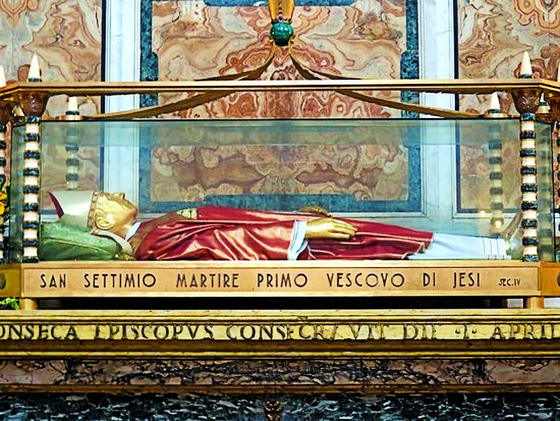 Although his place of burial was lost, by 1208 the Cathedral was named for him, His body was finally rediscovered in 1469 and translated to the Cathedral. In 1623 a new Altar was Consecrated to him where his body is now enshrined. His cult, however, had always been venerated because the Cathedral of Jesi was already dedicated to St Septimius.