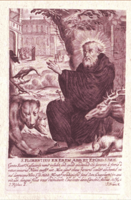 Florentius had started off with a hermitage in the wooded Haslach valley, near the present village of Oberhaslach. Several place-names in the vicinity bear out the tradition of this eremitic community, a site to the northeast of the village. References are given in Strasburg’s early Diocesan files to ‘Priests’ quarters, described as ‘of the Irish’. Considering that these sites were wiped out in the wars, the reference is most welcome and revealing. The pilgrims’ Church of Oberhaslach, does its part in keeping alive the Florentius tradition. The vintage image below shows St Florentius with wild animals on the edge of a ‘cityscape’ – it seems to indicate the many wondrous talents and achievements of this ancient Saint – what a pity we have such a sparcity of information on his holy life.
