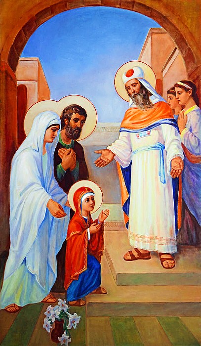 God heard their prayer and blessed them so greatly that they became the parents of the most holy of all human beings, Mary, the ever Blessed Virgin. For three years they kept this sacred treasure at home, after which time, although Mary was their only comfort, they resigned her with pious fortitude, in fulfilment of their vow. Hence they went, with their daughter, to Jerusalem, presented her to the priest in the Temple and Consecrated her, through his hands, to the service of the Almighty.