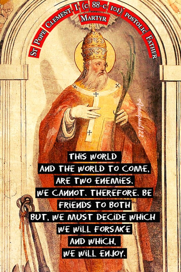 Saint of the Day – 23 November – St Clement I (c 88–c 101) Pope Martyr, Miracle-worker. St Clement is considered to be the first Apostolic Father of the Church, one of the three chief ones together with St Polycarp and St Ignatius of Antioch. Papal Ascensi,on c 88. Born in Rome, Italy and died by drowning at Chersonesus, Taurica, Bosporan Kingdom (modern Greece). Patronages – boatmen, sailors, marble workers, against blindness, sick children, stonecutters, Diocese of Aarhus, Denmark, Dundee, Scotland. Steenwijk, Netherlands, Velletri, Italy. Also known as – Clement of Rome, Clemens Romanus.