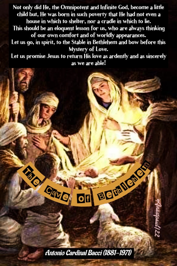 “My child, consider the hardships thou will have to undergo while on earth. Thou will be born in a cold cave, with no place to be laid except in the trough where animals come to feed.