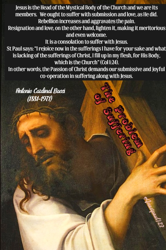 “Jesus is the Head of the Mystical Body of the Church and we are its members. We ought to suffer with submission and love, as He did. Rebellion increases and aggravates the pain. Resignation and love, on the other hand, lighten it, making it meritorious and even welcome. It is a consolation to suffer with Jesus. St Paul says: “I rejoice now in the sufferings I have for your sake and what is lacking of the sufferings of Christ, I fill up in my flesh, for His Body, which is the Church” (Col 1:24). In other words,the Passion of Christ demands our submissive and joyful co-operation in suffering along with Jesus.