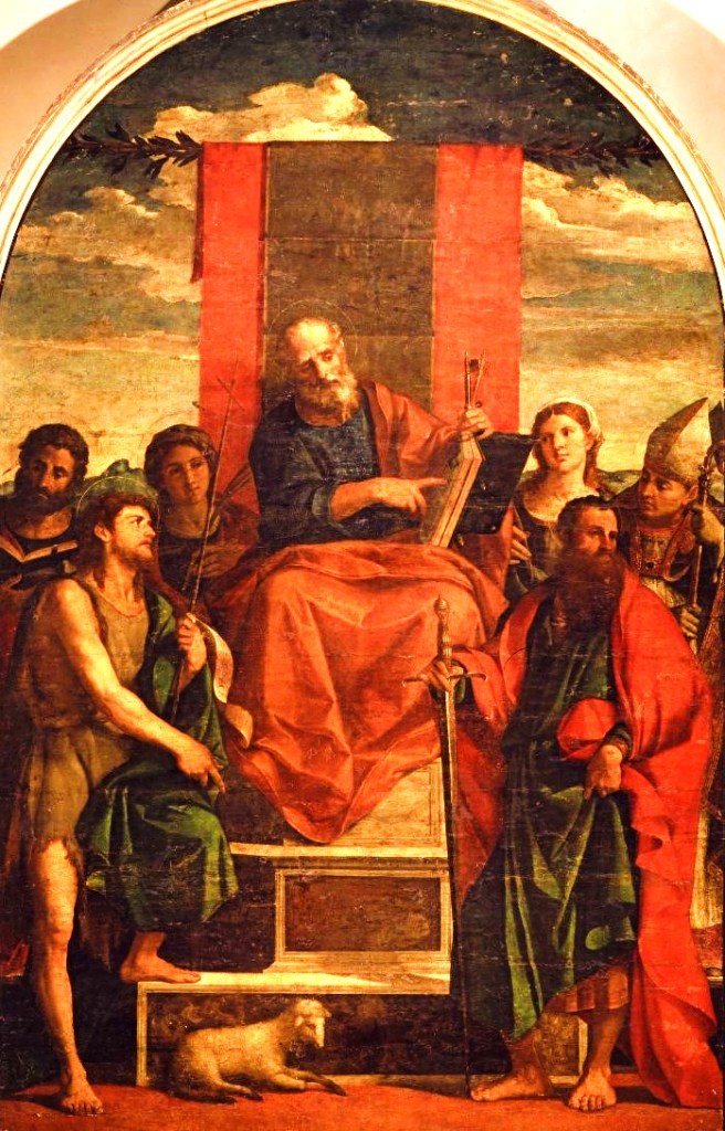 St Peter Enthroned with Sts Paul, Titian of Oderzo (to the left of St Peter), Justina of Padua, John the Baptist, Mark and Augusta. The Painting resides in tSt Titian’s Patronal Church of Fontanelle in Ceneda.