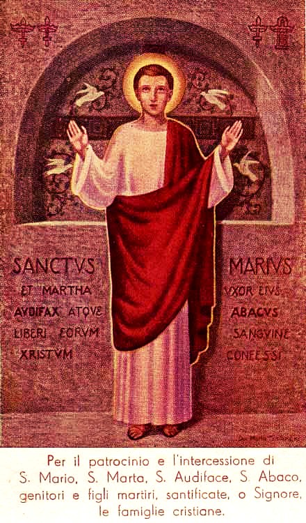 The Roman Martyrology today states: “At Rome, on the Cornelian road, the holy Martyrs, Marius and his wife Martha, with their sons, Audifax and Abachum, noble Persians, who came to Rome, through devotion, in the time of the Emperor Claudius. After they had been beaten with rods, tortured on the rack and with fire, lacerated with iron hooks and had endured the cutting off their hands, Martha was put to death in the place called Nympha. The others, were beheaded and cast into the flames.”