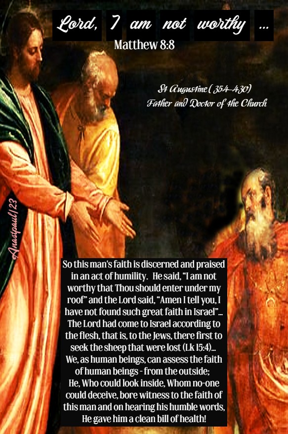 So this man’s faith is discerned and praised in an act of humility. He said, “I am not worthy that Thou should enter under my roof” and the Lord said, “Amen I tell you, I have not found such great faith in Israel”… The Lord had come to Israel according to the flesh, that is, to the Jews, there first to seek the sheep that were lost (Lk 15:4)… We, as human beings, can assess the faith of human beings – from the outside; He, Who could look inside, Whom no-one could deceive, bore witness to the faith of this man and on hearing his humble words, He gave him a clean bill of health!” – St Augustine (354-430) Bishop of Hippo, Father and Doctor of the Church (Sermon 62).