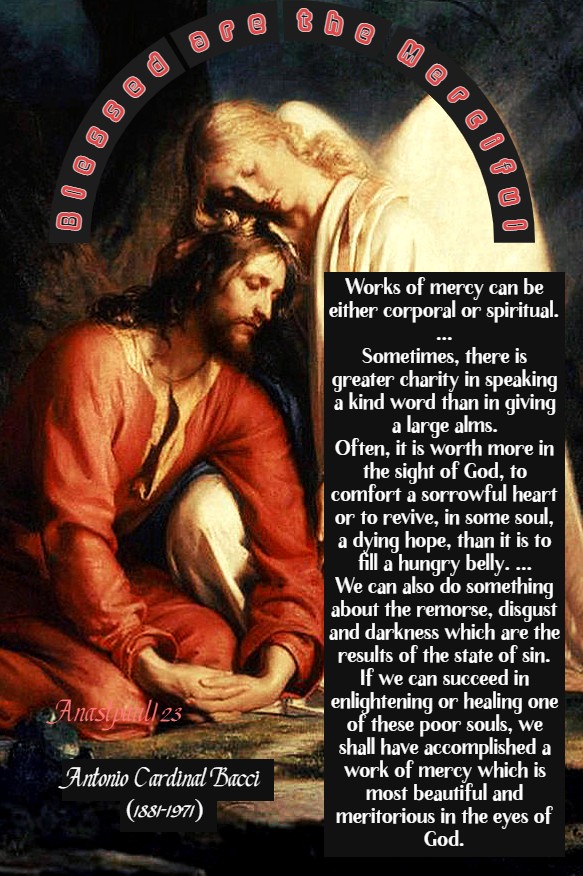 “Works of mercy can be either corporal or spiritual. The former cannot be practised much by those who are poor but, any generous-minded Christian can perform the latter. Sometimes, there is greater charity in speaking a kind word than in giving a large alms. Often, it is worth more in the sight of God, to comfort a sorrowful heart or to revive, in some soul, a dying hope, than it is to fill a hungry belly.