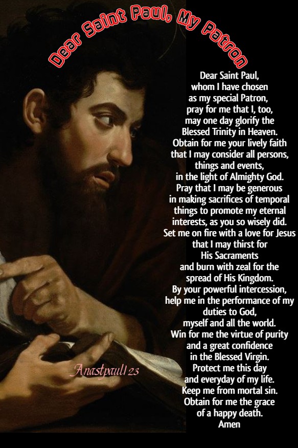 PRAYER – O God, Who taught the whole world by the preaching of Thy blessed Apostle Paul, grant, we beseech Thee that we, who today celebrate his conversion, may draw closer to Thee, by way of hia example.Through Jesus Christ, Thy Son our Lord, Who lives and reigns with Thee, in the unity of the Holy Ghost, God, world without end. Amen (Collect).