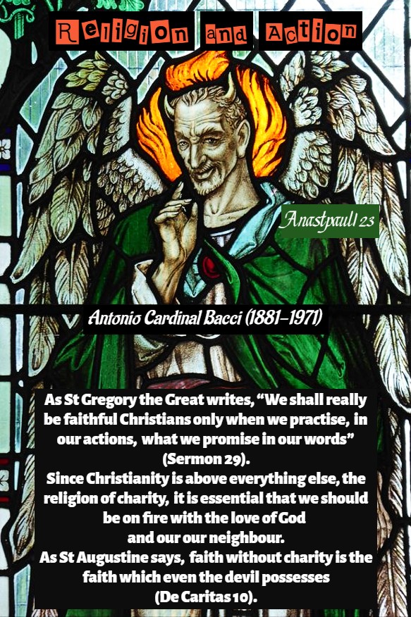 “If we wish to be true and sincere Christians, it is not enough to believe, nor is it enough to attend the ceremonies of religion, We must act like true Christians. As St Gregory the Great writes, “We shall really be faithful Christians only when we practise, in our actions, what we promise in our words” (Sermon 29). Since Christianity is above everything else, the religion of charity, it is essential that we should be on fire with the love of God and our our neighbour. As St Augustine says, faith without charity is the faith which even the devil possesses (De Caritas 10).”