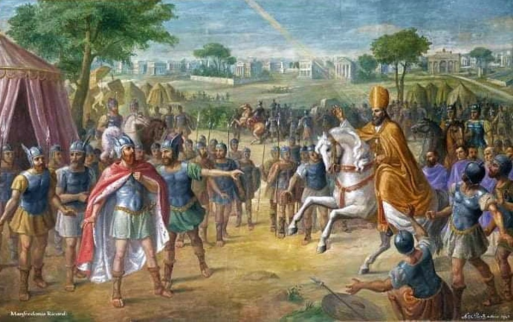 After two years, in 492, Siponto was besieged by the barbarian King Odoacer, the Christian forces were now their close to collapsing, when our Saint Lorenzo managed to obtain a three-day truce from the King which the Bishop and the faithful employed more in prayer and penance, than in reconstituting their strength for a battle already lost at the start.