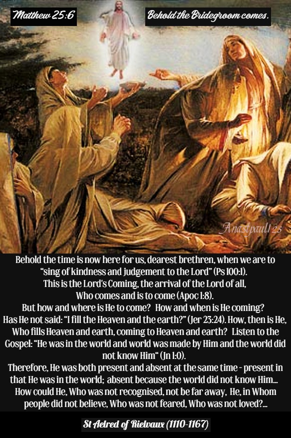 In truth, my Lord, not my righteousness but Thy mercy guided Thee; not Thy necessity but my need. As Thou hast said: “My mercy is established in the heavens” (Ps 89[88],3). Rightly so, for our neediness abounds on earth. That is why “I shall sing forever of Thy love, O Lord,” which Thou manifested at Thy coming. When He showed Himself humble in His humanity, powerful in His miracles, strong against the tyranny of the demons, gentle in His welcome of sinners: all these things came from His mercy, all came from His inmost goodness. That is why “I shall sing Thy love, O Lord“ made known at Thy First Coming. And rightly so, for “the earth is filled with the mercy of the Lord” (Ps 118:64).” – St Aelred of Rielvaux (1110-1167) Cistercian Monk [Sermon for Advent (Durham collection)].
