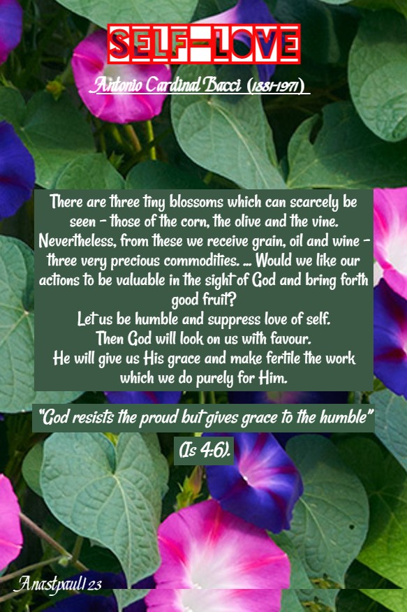 Let us be humble and suppress love of self. Then God will look on us with favour. He will give us His grace and make fertile the work which we do purely for Him. “God resists the proud but gives grace to the humble” (Is 4:6).