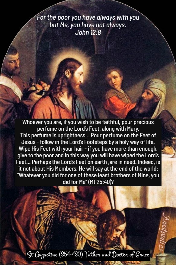 REFLECTION – “This is the historical event, now let us look for the symbol. Whoever you are, if you wish to be faithful, pour precious perfume on the Lord’s Feet, along with Mary. This perfume is uprightness… Pour perfume on the Feet of Jesus – follow in the Lord’s Footsteps by a holy way of life. Wipe His Feet with your hair – if you have more than enough, give to the poor and in this way you will have wiped the Lord’s Feet… Perhaps the Lord’s Feet on earth ,are in need. Indeed, is it not about His Members, He will say at the end of the world: “Whatever you did for one of these least brothers of Mine, you did for Me” (Mt 25:40)?