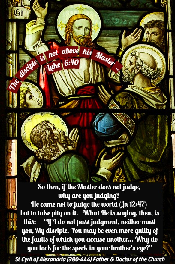 So then, if the Master does not judge, why are you judging? He came not to judge the world (Jn 12:47) but to take pity on it. What He is saying, then, is this: “If I do not pass judgment, neither must you, My disciple. You may be even more guilty of the faults of which you accuse another… Why do you look for the speck in your brother’s eye?” – St Cyril of Alexandria (380-444) Bishop, Father and Doctor of the Church (Commentary on the Gospel of Luke, 6).