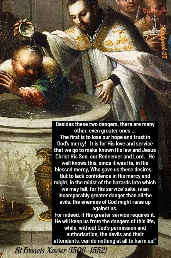 The first is to lose our hope and trust in God’s mercy! It is for His love and service that we go to make known His law and Jesus Christ His Son, our Redeemer and Lord. He well knows this, since it was He, in His blessed mercy, Who gave us these desires. But to lack confidence in His mercy and might, in the midst of the hazards into which we may fall, for His service’ sake, is an incomparably greater danger than all the evils, the enemies of God might raise up against us. For indeed, if His greater service requires it, He will keep us from the dangers of this life, while, without God’s permission and authorisation, the devils and their attendants, can do nothing at all to harm us!” – St Francis Xavier (1506-1552) Jesuit Missionary (Letter 131:22 October 1552).