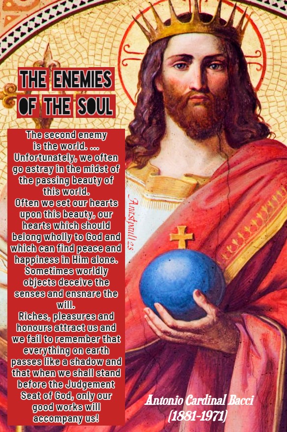 “The second enemy is the world. There are so many beautiful things around us reflecting the power and the goodness of God. These should be an invitation to us to love their Creator and a spiritual ladder which leads us towards Him. Unfortunately, we often go astray in the midst of the passing beauty of this world. Often we set our hearts upon this beauty, our hearts which should belong wholly to God and which can find peace and happiness in Him alone. Sometimes worldly objects deceive the senses and ensnare the will. Riches, pleasures and honours attract us and we fail to remember that everything on earth passes like a shadow and that when we shall stand before the Judgement Seat of God, only our good works will accompany us!”