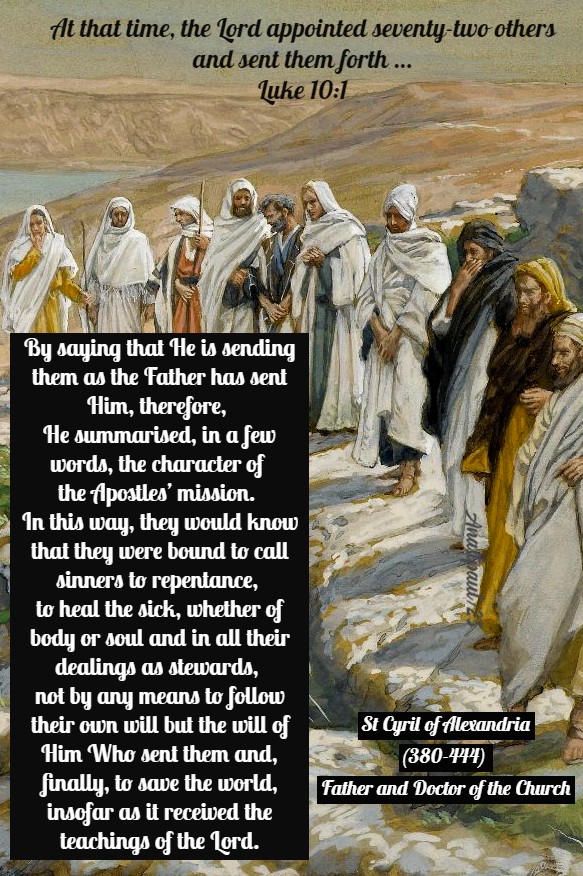 By saying that He is sending them as the Father has sent Him, therefore, He summarised, in a few words, the character of the Apostles’ mission. In this way, they would know that they were bound to call sinners to repentance, to heal the sick, whether of body or soul and in all their dealings as stewards, not by any means to follow their own will but the will of Him Who sent them and, finally, to save the world, insofar as it received the teachings of the Lord.” – St Cyril of Alexandria (380-444) Bishop, Father and Doctor of the Church (Commentary on the Gospel of John 12:1).